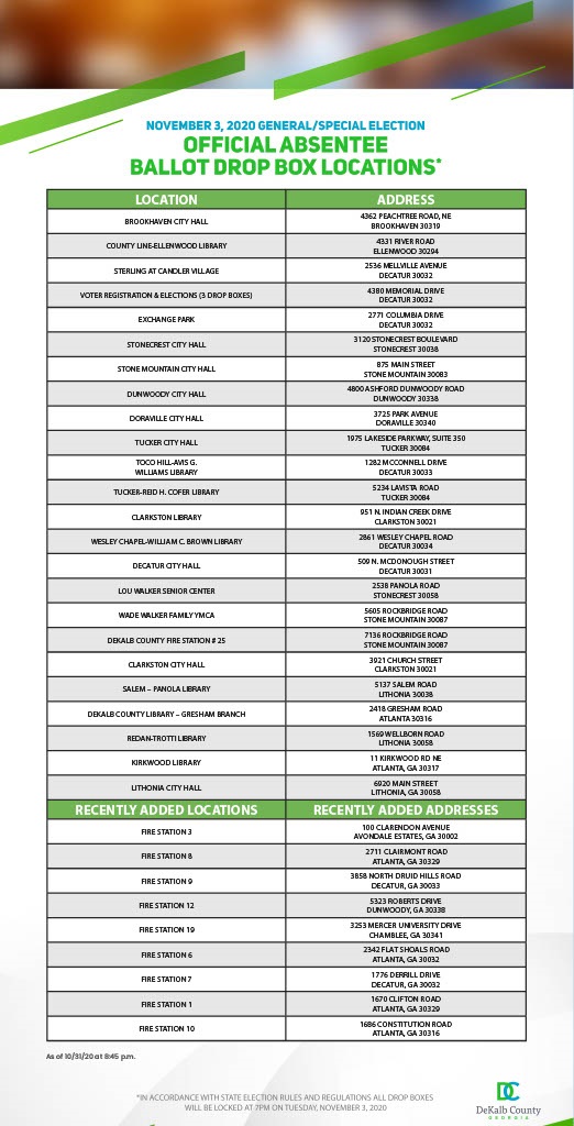 Additional Ballot Box Locations Added- Drop off Your Absentee Ballot TODAY! kelly cato2020-11-01T19:36:26+00:00November 1st, 2020|News| View Larger Image Share This Story, Choose Your Platform! FacebookTwitterLinkedInRedditGoogle+TumblrPinterestVkEmail Related Posts Senate Runoff Election Needs All Of Our Attention- Vote TODAY! DeKalb Offers Free Christmas Tree Curbside Collection Christmas Eve Storm System- Wet or White? Whichever…Be Careful! DeKalb Announces Christmas and New Year’s Residential Sanitation Schedule DeKalb County Tax Commissioner’s Holiday Hours Leave A Comment Cancel replyComment Save my name, email, and website in this browser for the next time I comment.